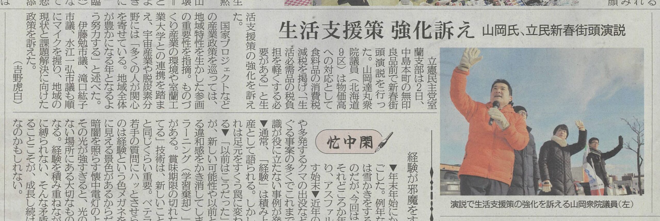 [メディア掲載情報]2026.01.03室蘭民報「生活支援強化訴え~山岡氏、立民新春街頭演説」 | 山岡達丸オフィシャルサイト